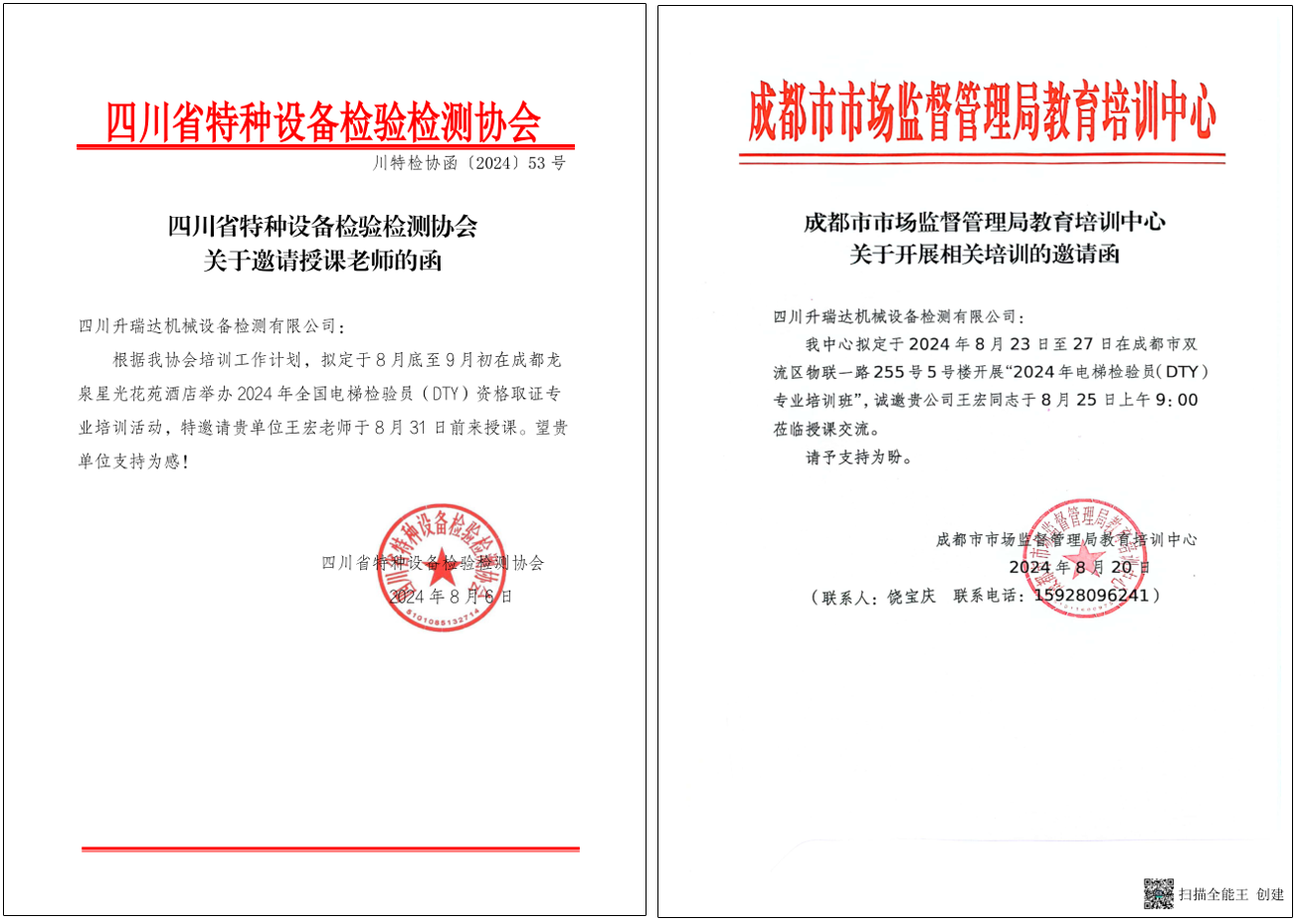 ? ? ? ? 近日,升瑞達檢驗師王宏老師,憑借其卓越的專業素養和深厚的技術功底,受到川內兩大權威機構的盛情邀請,分別參與了四川省特種設備檢驗檢測協會舉辦的2024年全國電梯檢驗員(DTY)資格取證專業培訓活動授課,以及成都市市場監督管理局教育培訓中心開展的 “2024 年電梯檢驗員 (DTY) 專業培訓班” 授課。
