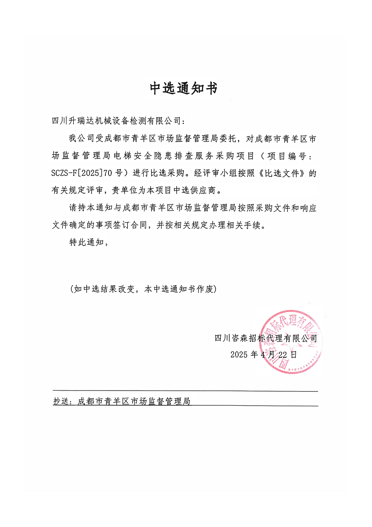 近日,四川升瑞達機械設(shè)備檢測有限公司在青羊區(qū)電梯安全隱患排查服務(wù)項目的激烈競標(biāo)中脫穎而出,成功斬獲中標(biāo)資格。這一成果不僅是對公司專業(yè)實力的有力佐證,更為其在電梯檢測領(lǐng)域的深度拓展注入強大動能。